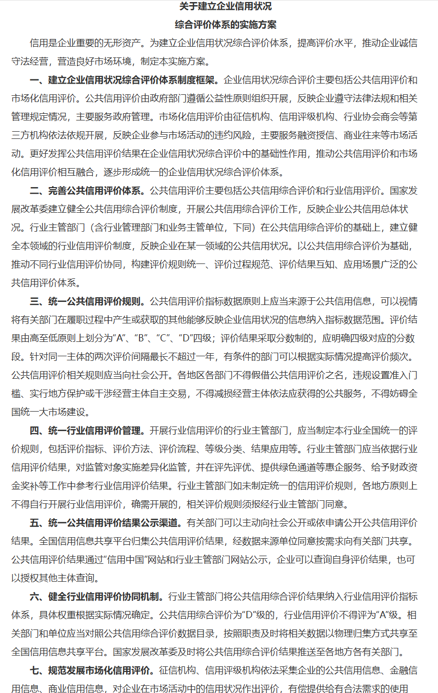 《关于建立企业信用状况综合评价体系的实施方案》已经国务院同意,现印发给你们,请认真贯彻执行。